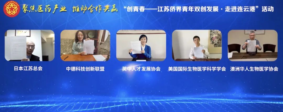 活動中,集團公司通過線上方式,與日本江蘇總會、中德科技創新聯盟、英中人才發展協會、美國國際生物醫學學會、澳洲華人生物醫學科學協會等海外僑社團簽署了合作意向書;集團公司國際醫藥創新產業園與4家省內僑青企業現場簽訂合作協議。