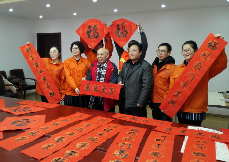 1月20日,連云港市雜文學(xué)會(huì)邀請(qǐng)陳鳳桐等3名知名書(shū)法家走進(jìn)華茂綠化工程公司,為一線環(huán)衛(wèi)職工寫(xiě)春聯(lián),送上濃濃的新春祝福! (工 茂)