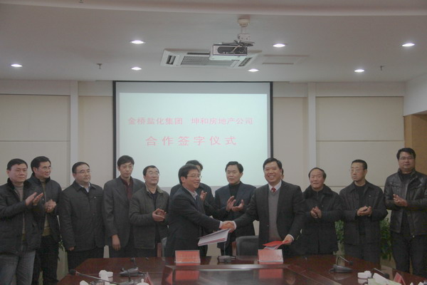 12月30日下午,集團公司領導顧永庚、胡建明、楊國新等來到灌云縣人民政府,與灌云縣委書記、縣人大常委會主任魯林、縣長陸永軍等領導親切會談,共商合作事宜。在會談中,集團公司與灌云縣人民政府簽訂了礦鹵鹽田合作協議,與坤和房地產公司簽訂了東園酒店合作協議,并委托公司代表集團公司,全權管理東園國際大酒店。