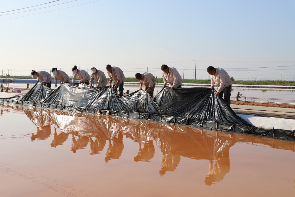 在破曉時分,日曬制鹽的萬畝鹽田被一輪旭日染上了一層金色的光輝,仿佛一夜之間,這片鹽堿地被冰封的魔力所籠罩,呈現出一種寧靜而又深邃的景象。凌晨4點半,那些勤勞的鹽灘工人早已熱火朝天地忙著活碴、修補塑布、加固浮板等保鹽保鹵工作。省勞模祝星星在巡灘時說道:“現在正處梅雨季節,我們戰高溫、搶晴天,在做好原鹽生產的基礎上,更要統籌做好防汛抗災工程,確保安穩度汛。當然,我們對今年超額完成生產指標任務充滿信心。”這番話無疑是對他們辛勤勞作的一種樂觀詮釋。
