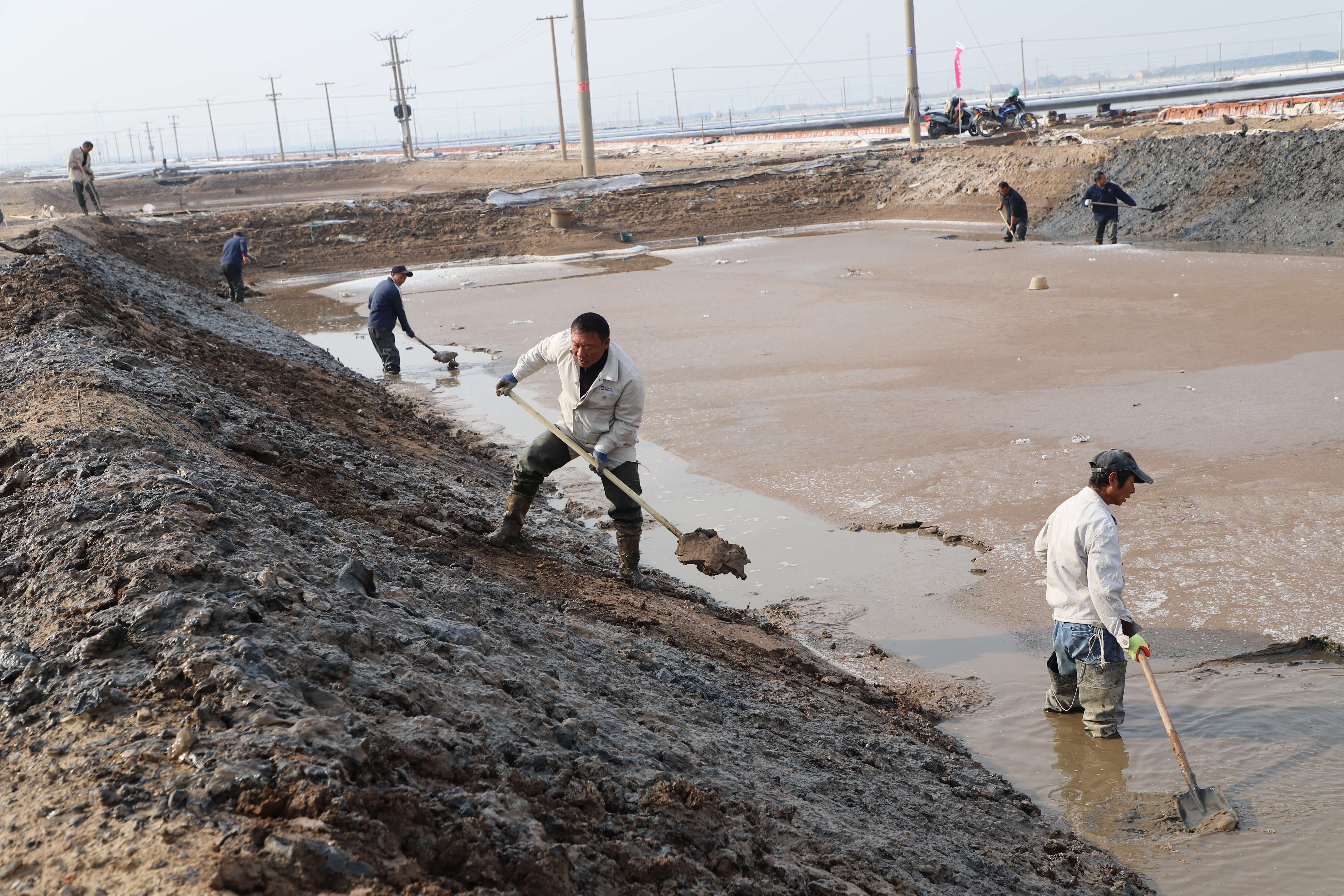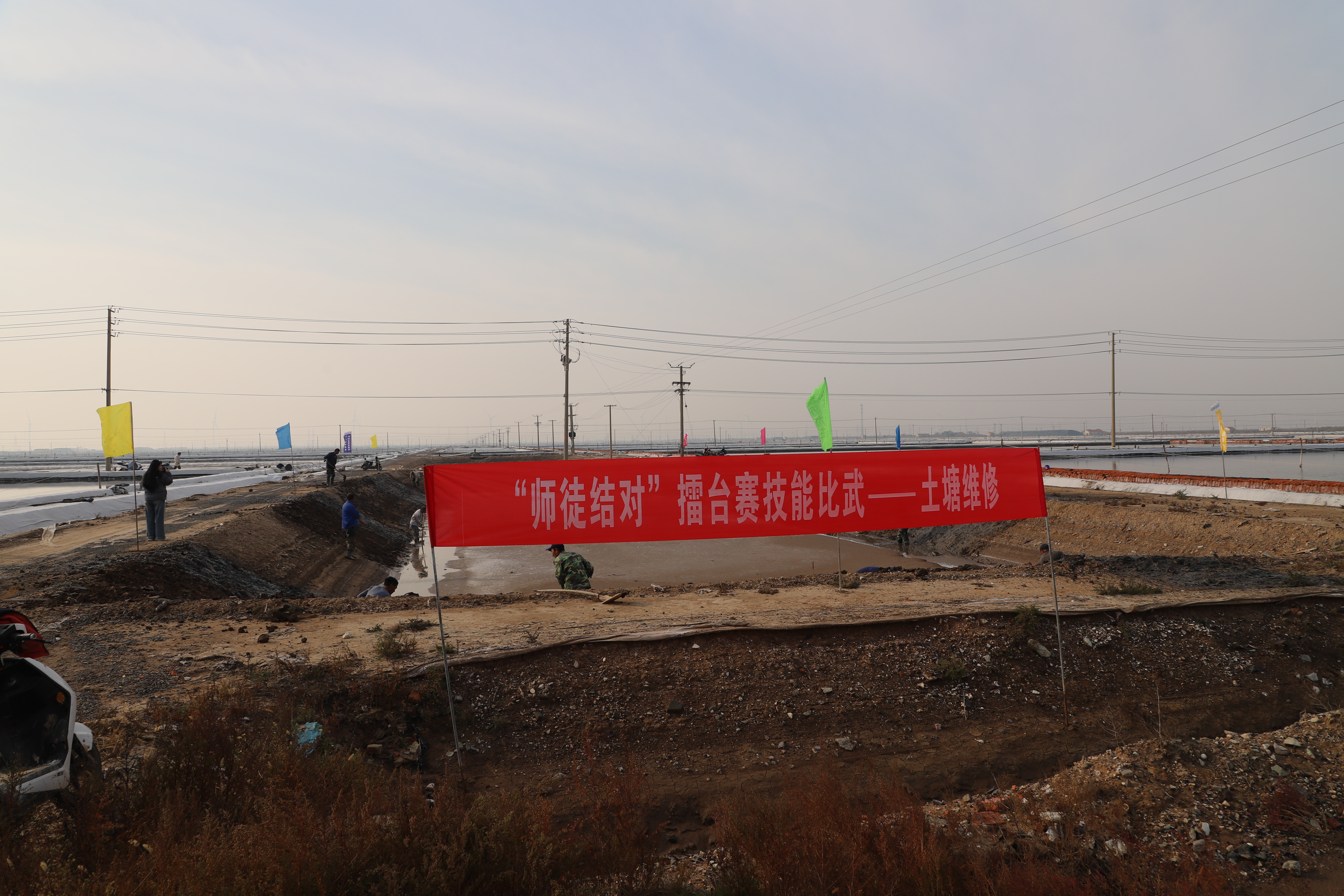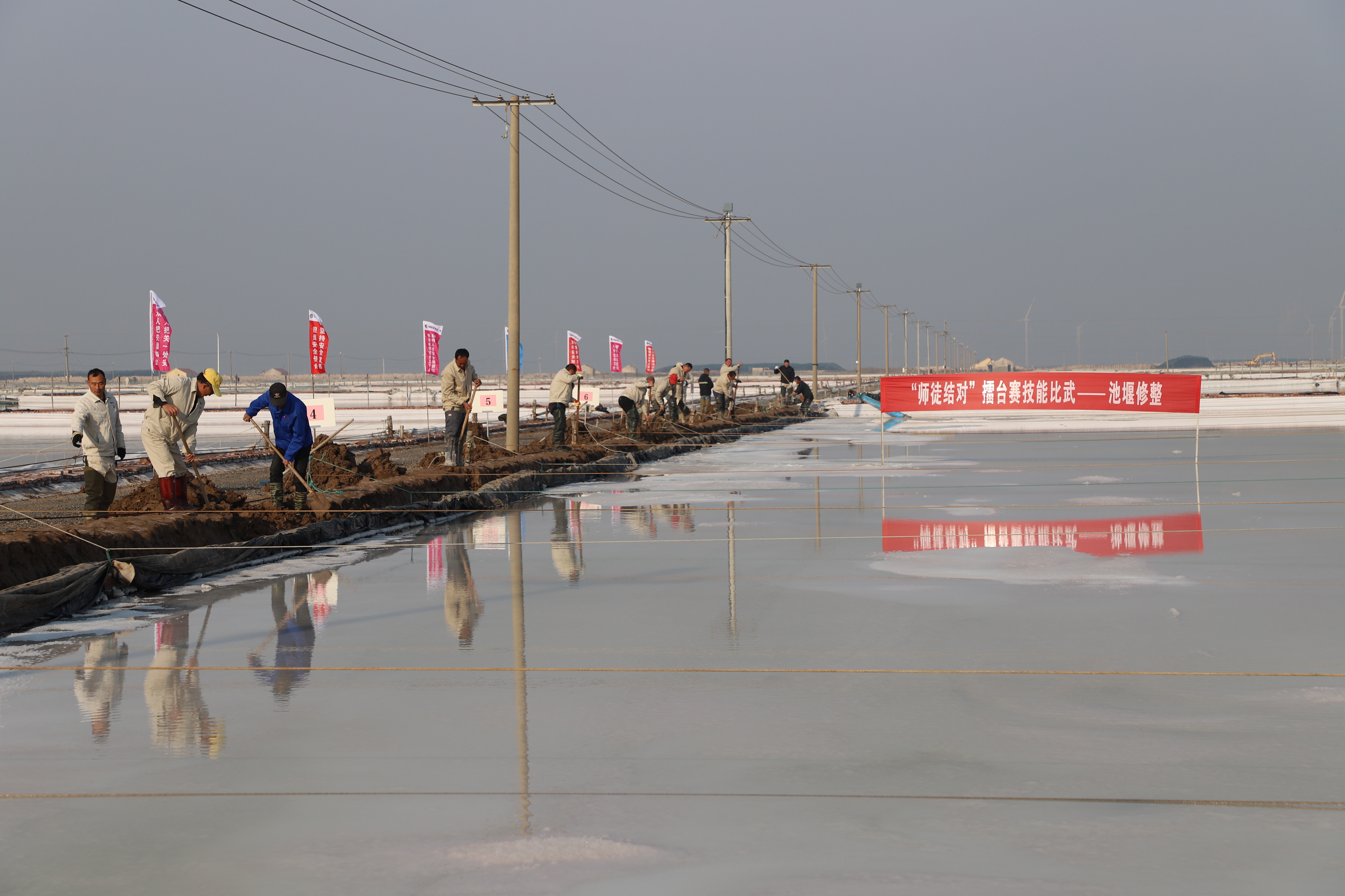 寒冬時節,暖陽之下,鹽廩之旁,曬得黝黑的鹽場產業工人們按照競賽的考核標準,做熟泥、打堰墻、做堰頂,護埝頂、夯埝坡、清塘底,由此,見證了一場技能比拼的盛會。