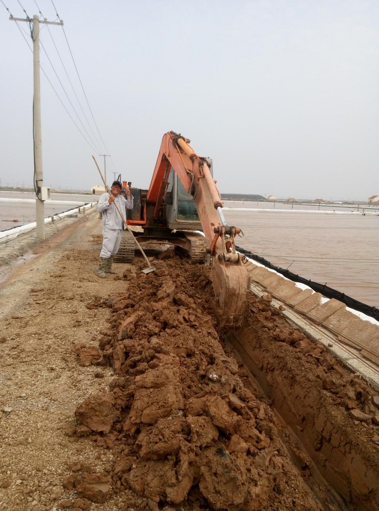 埒南制鹽分公司8班,伴隨著挖掘機的轟鳴,日曬制鹽公司生產班組“天溝工程”正式進入施工試驗階段。天溝是海鹽生產的配套設施,在結晶區利用天溝加鹵能有效的減少鹵水的混雜,實行分質分段結晶,是提高原鹽質量的重要手段。日曬制鹽公司經過反復調研論證,用傳統海鹽生產工藝架接礦鹵生產,在生產班組架設天溝,實施串聯、并聯加鹵相結合,給鹵水的調配、除硫、除混帶來便利,實現分質分段結晶,為原鹽質量的提高寫下了重重的一筆,同時天溝加鹵可以減少班組流動機泵的使用頻率,提高了班組整體安全生產系數。