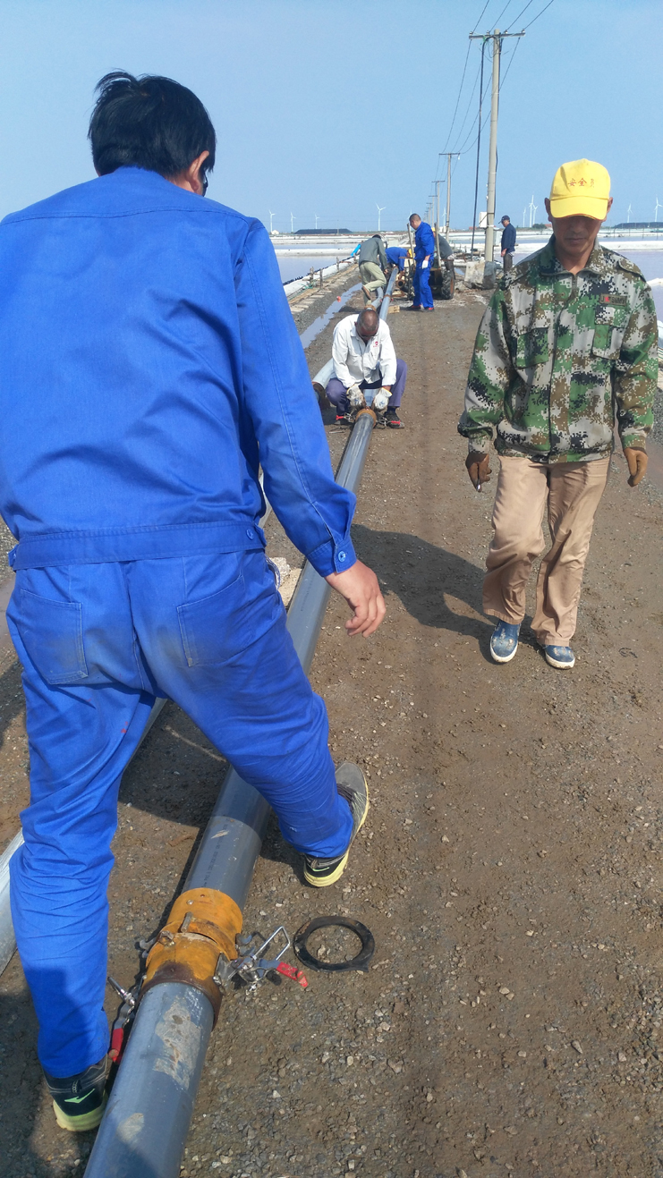 為節省扒鹽管道拆、裝時間,提高扒鹽速度,減輕扒鹽人員負荷,6月11日上午機電服務公司新制快接管道在埒南制鹽公司11班進行現場實踐。他們放棄休息日,制作人員全員參與,市勞模王緒華、一星級員工程洪連、黨員楊軍,他們個個不怕臟和累,經過一個多小時操作,管道安裝結束,在幾次調試后,扒鹽機組運行正常。該快速接頭優點是安裝、拆解快捷,節約成本,不足是皮墊易漏鹵。通過此次試運行,對不足之處,該公司將繼續研究,爭取早日投入鹽業生產,創造效益。(機電服務公司)