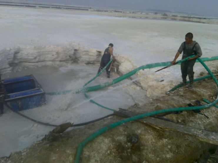 近日來,連續(xù)高溫酷暑天氣對日曬制鹽員工提出了生理挑戰(zhàn),新河制鹽廣大員工直面高溫,不畏酷暑,積極做好除硫工作,保證原鹽質量。圖為除硫現(xiàn)場操作手緊握高壓水槍,對硫酸鈣沉淀區(qū)進行沖刷。(新河制鹽 邱利民)