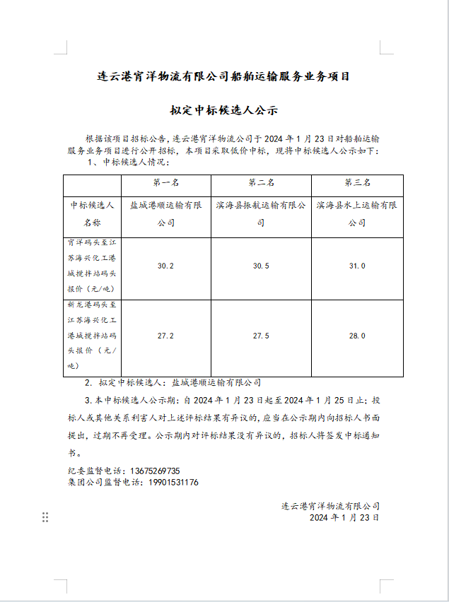 連云港宵洋物流有限公司船舶運(yùn)輸服務(wù)業(yè)務(wù)項(xiàng)目擬定中標(biāo)候選人公示