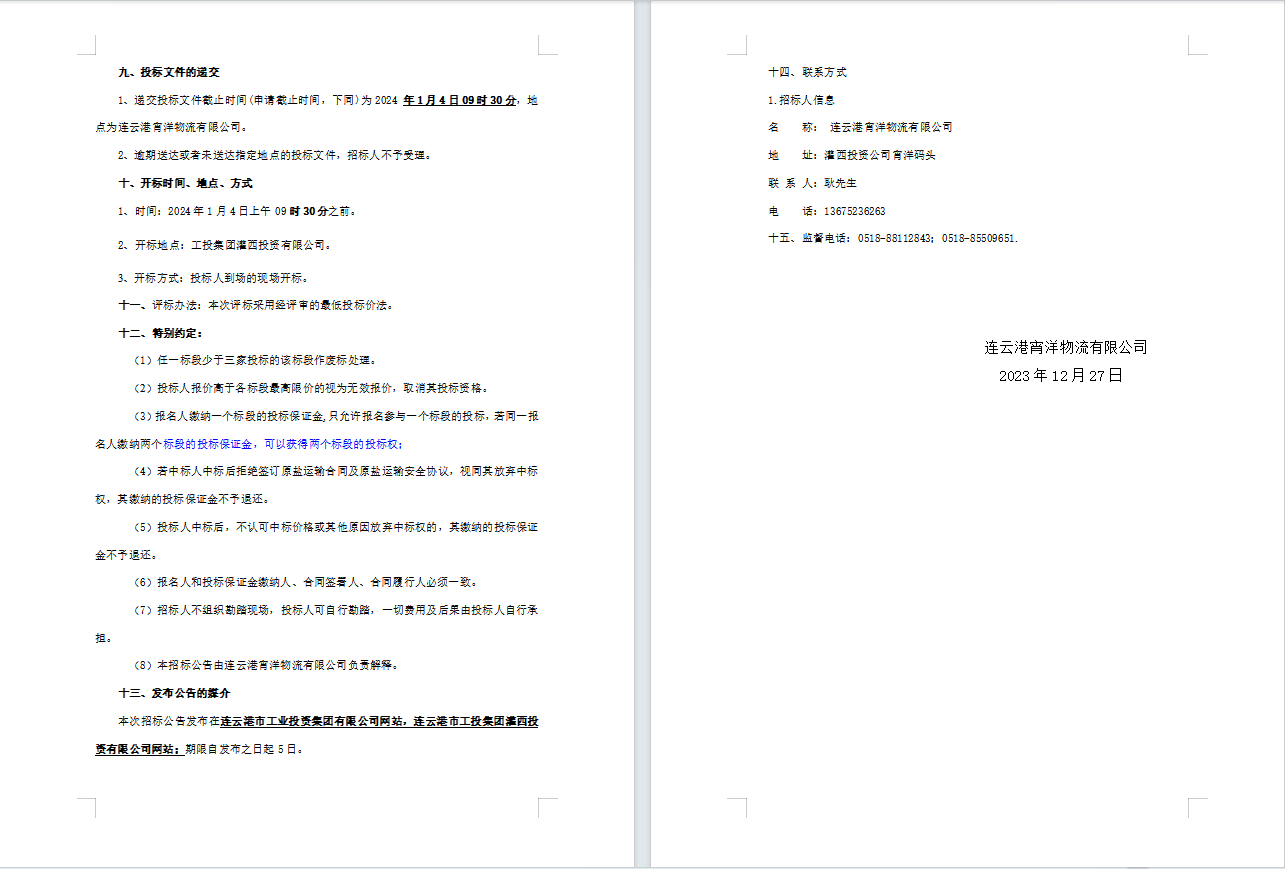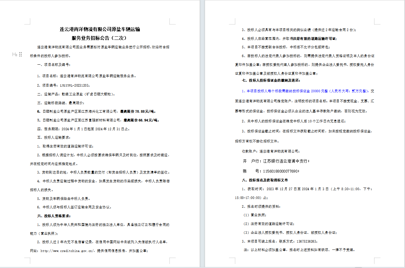 連云港宵洋物流有限公司原鹽車輛運輸服務(wù)業(yè)務(wù)招標(biāo)公告(二次)