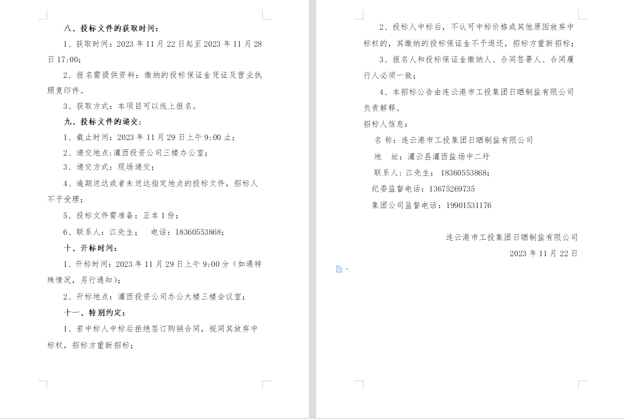 連云港市工投集團日曬制鹽有限公司2023年度員工工作服采購項目邀請招標公告