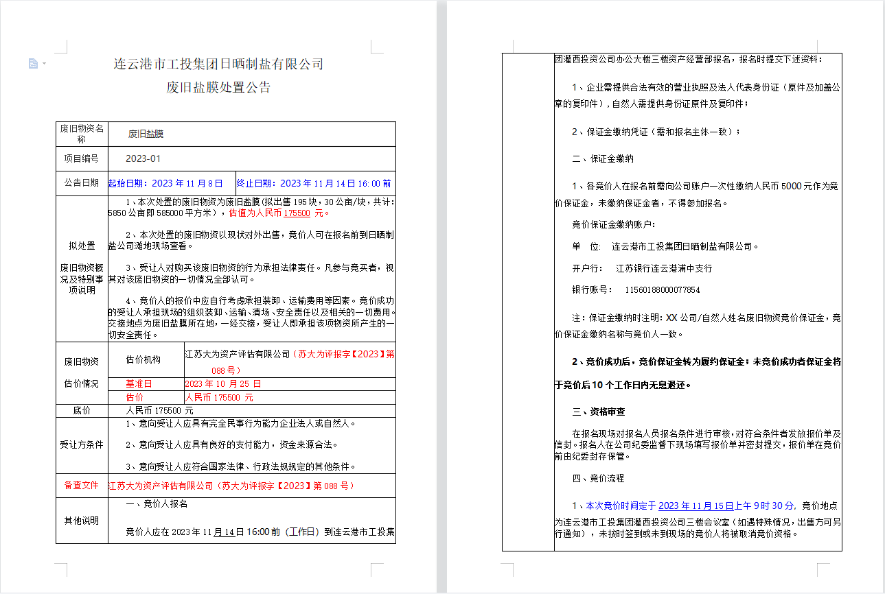 連云港市工投集團日曬制鹽有限公司廢舊鹽膜處置公告
