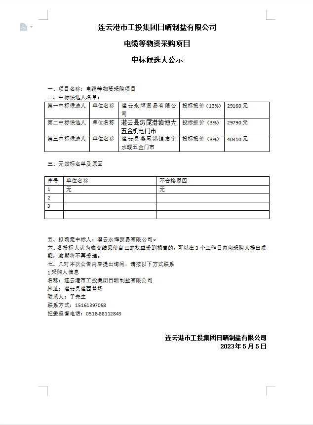 連云港市工投集團日曬制鹽有限公司電纜等物資采購項目中標候選人公示