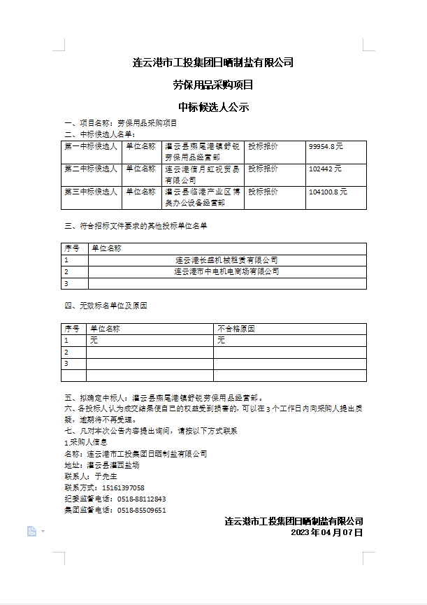 連云港市工投集團日曬制鹽有限公司勞保用品采購項目