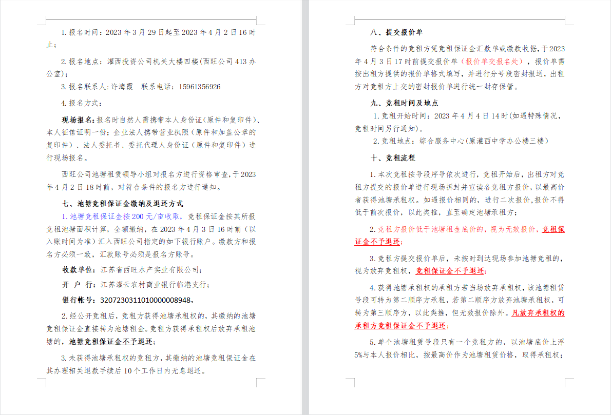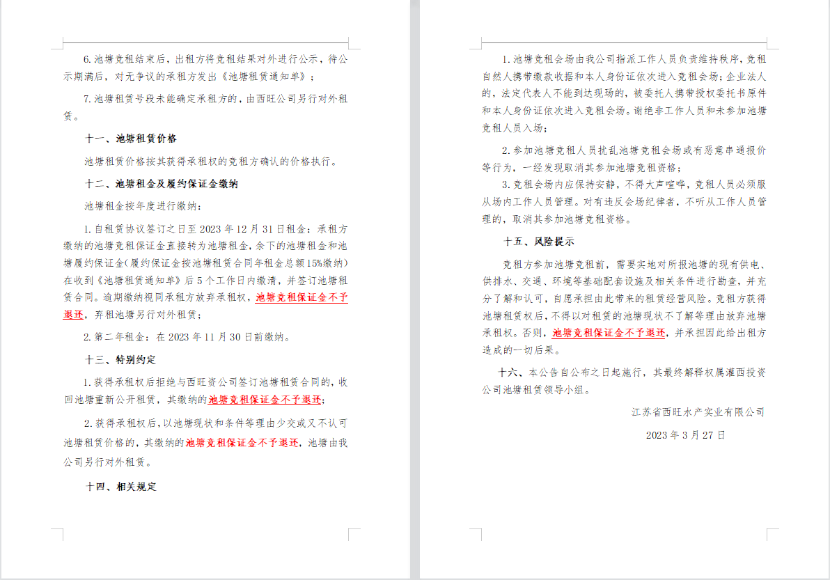 江蘇省西旺水產實業有限公司2023年度淡水養殖池塘公開競租第二次公告