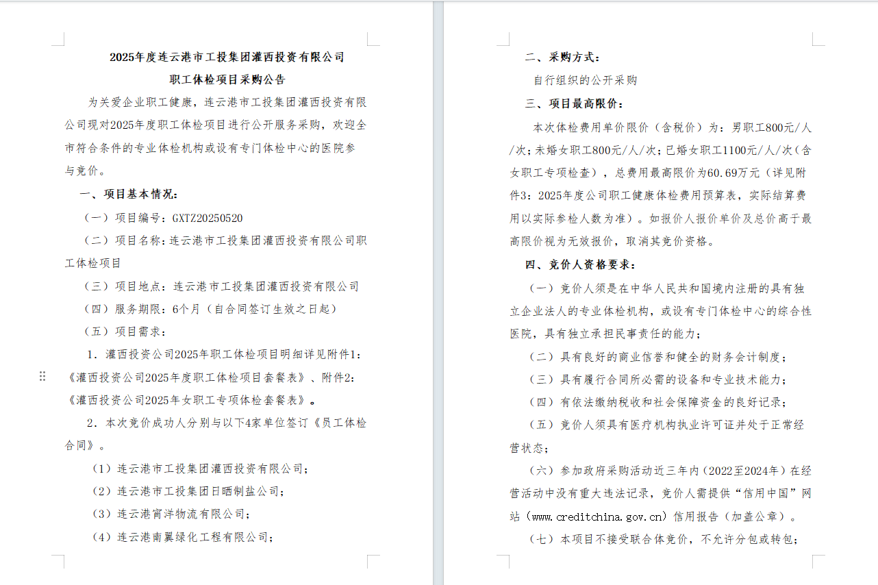 2025年度連云港市工投集團灌西投資有限公司職工體檢項目采購公告