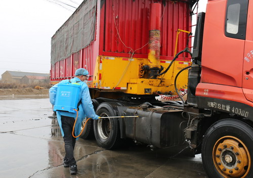 加工鹽車(chē)間副主任李畢軍正在對(duì)外來(lái)車(chē)輛進(jìn)行消毒。
