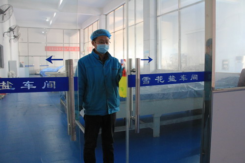 雪花鹽車(chē)間主任助理萬(wàn)平正在對(duì)車(chē)間關(guān)鍵區(qū)域進(jìn)行消毒。