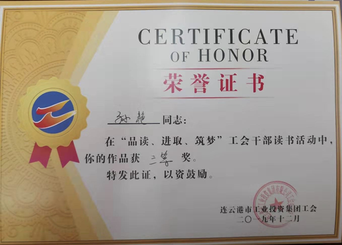 ????在集團公司工會“品讀、進取、筑夢”主題讀書活動中,孫艷同志憑借《光輝的思想 指路的明燈 讀<毛澤東詩詞全編鑒賞>有感》,獲得三等獎。
