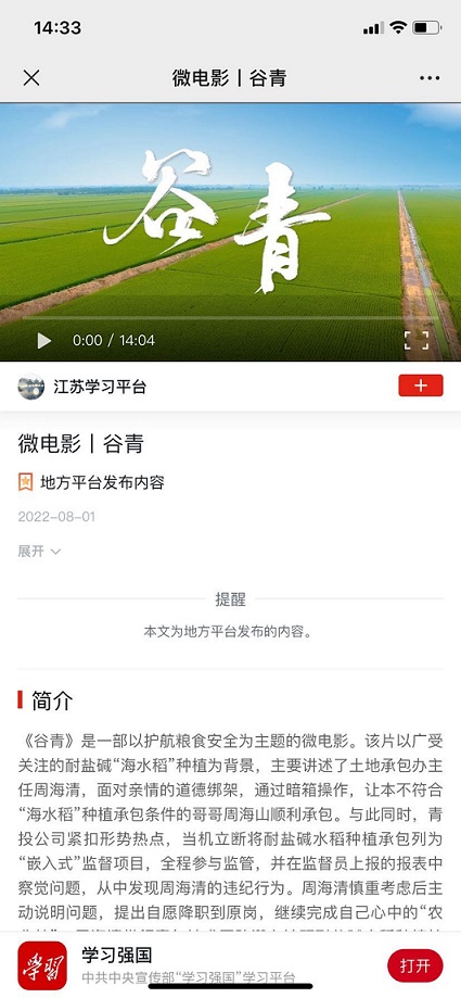 近日,由連云港市工投集團(tuán)青口投資公司自編自演的微電影《谷青》入選學(xué)習(xí)強(qiáng)國(guó)---江蘇學(xué)習(xí)平臺(tái)。