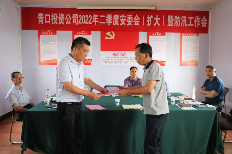 演練結束后,工作會在承擔主要防汛任務的三洋分場召開。會上,生產安全部匯報二季度安全工作情況,副總經理許太冬傳達《關于深刻汲取近期事故教訓采取嚴厲措施堅決遏制事故多發勢頭的通知》,副總經理楊守明布置公司安全工作及防汛工作,各單位遞交2022年度防汛工作責任書。