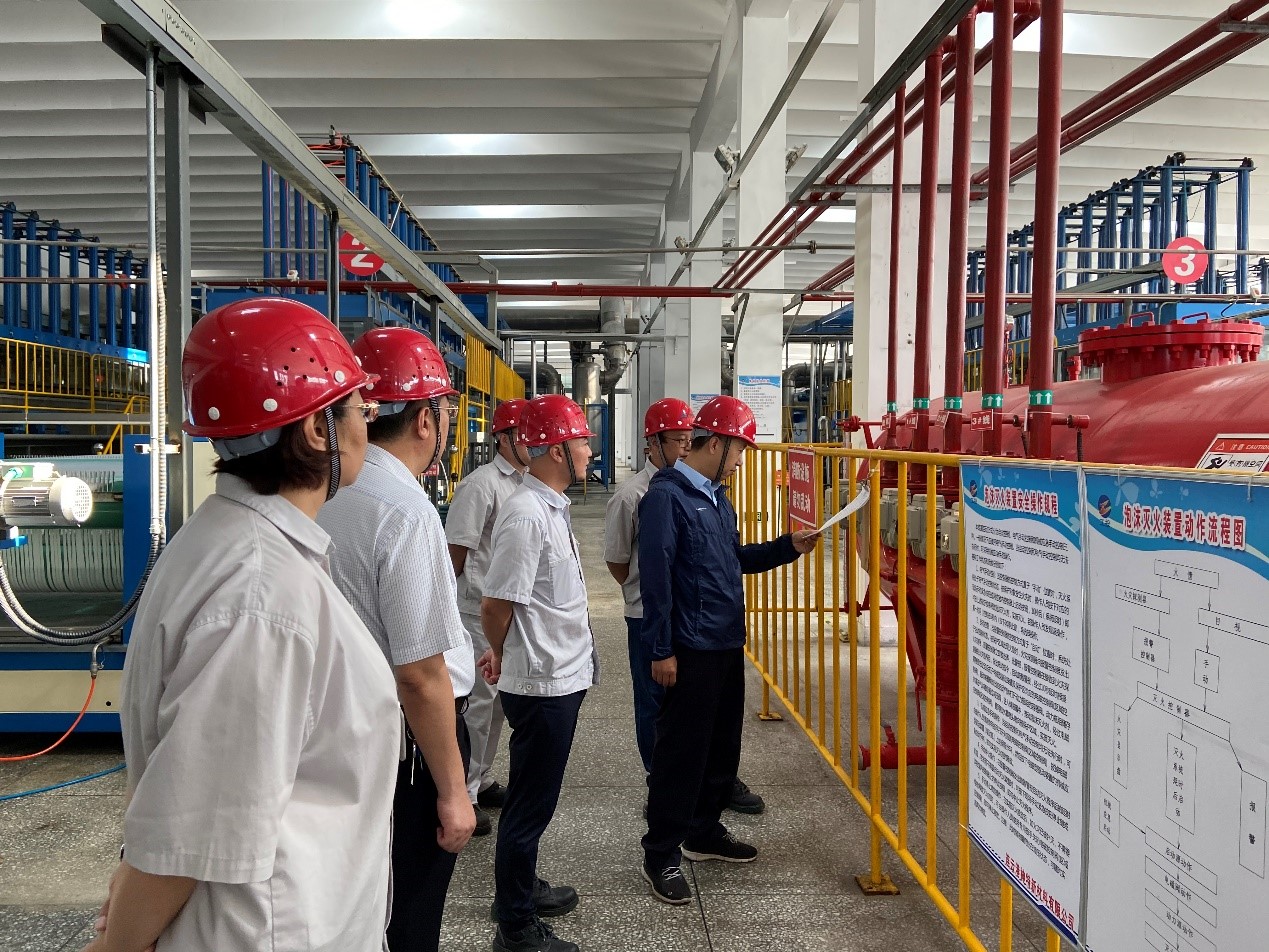 檢查組一行查看了公司生產線,詳細了解新增泡沫消防滅火系統、安全設備運行、安全投入、生產經營等情況。市國資委黨委委員、副主任許峰強調,生產企業務必要壓實安全責任,強化安全意識,防范和化解安全風險,切實確保十一期間安全生產穩定運行。