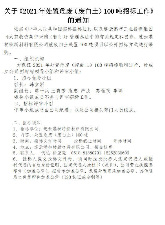 關于《2021年處置危廢(廢白土)100噸招標工作》的通知
