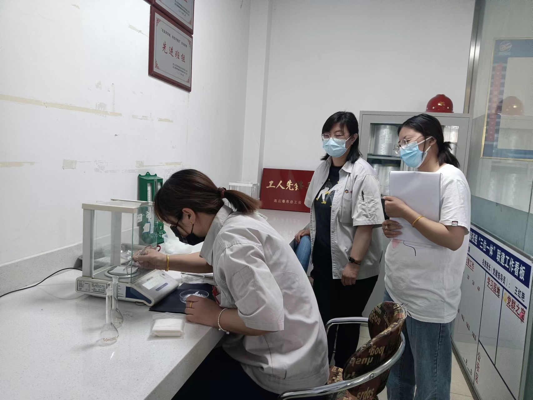 5月26日上午9點(diǎn),化驗(yàn)班組準(zhǔn)時(shí)開始比賽,選手們聚精會神的調(diào)整天平水平、置零、稱量蠟紙、置零、再稱量凍膠絲、放入容量瓶,一套操作如行云流水般一氣呵成。最終,吳珊珊同志在非常接近的比分中以2分53秒86險(xiǎn)勝!