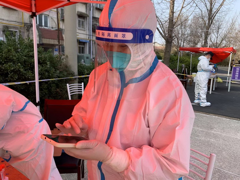 ▲ 海州區(qū)幸福路街道防疫主力隊員—秦英