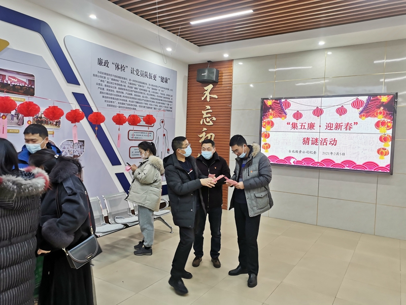 2月5日上午,臺北廉政文化教育室中人聲鼎沸,氣氛活躍,公司紀委“集五廉·迎新春”猜謎活動在干部職工中掀起一股節前廉政熱潮。