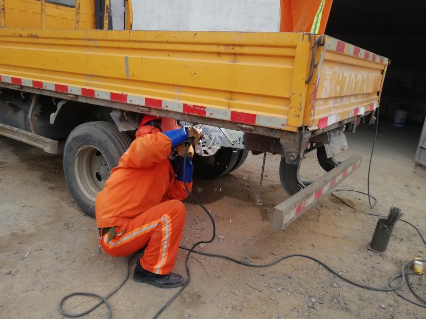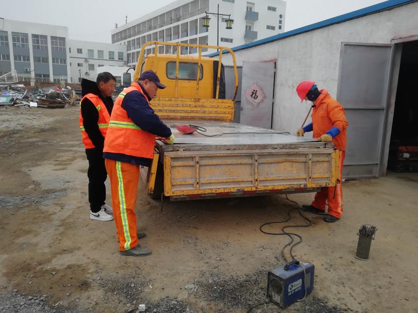 1月9日上午,經(jīng)過該公司設(shè)備維修班組再三斟酌,考慮如送修理廠維修,不但產(chǎn)生一筆不小的維修費(fèi)用,而且等待維修過程時(shí)間較長,影響工作進(jìn)度,為能給公司節(jié)省開支和不影響工作進(jìn)度,維修人員量好車廂底板尺寸后,將鐵板切割出需要的尺寸,一塊塊拼湊起來,加固在車廂底板上,通過半天的時(shí)間,順利為工具車底板披上一層合身、漂亮又特別的“盔甲”,有效延續(xù)了它的使用壽命。